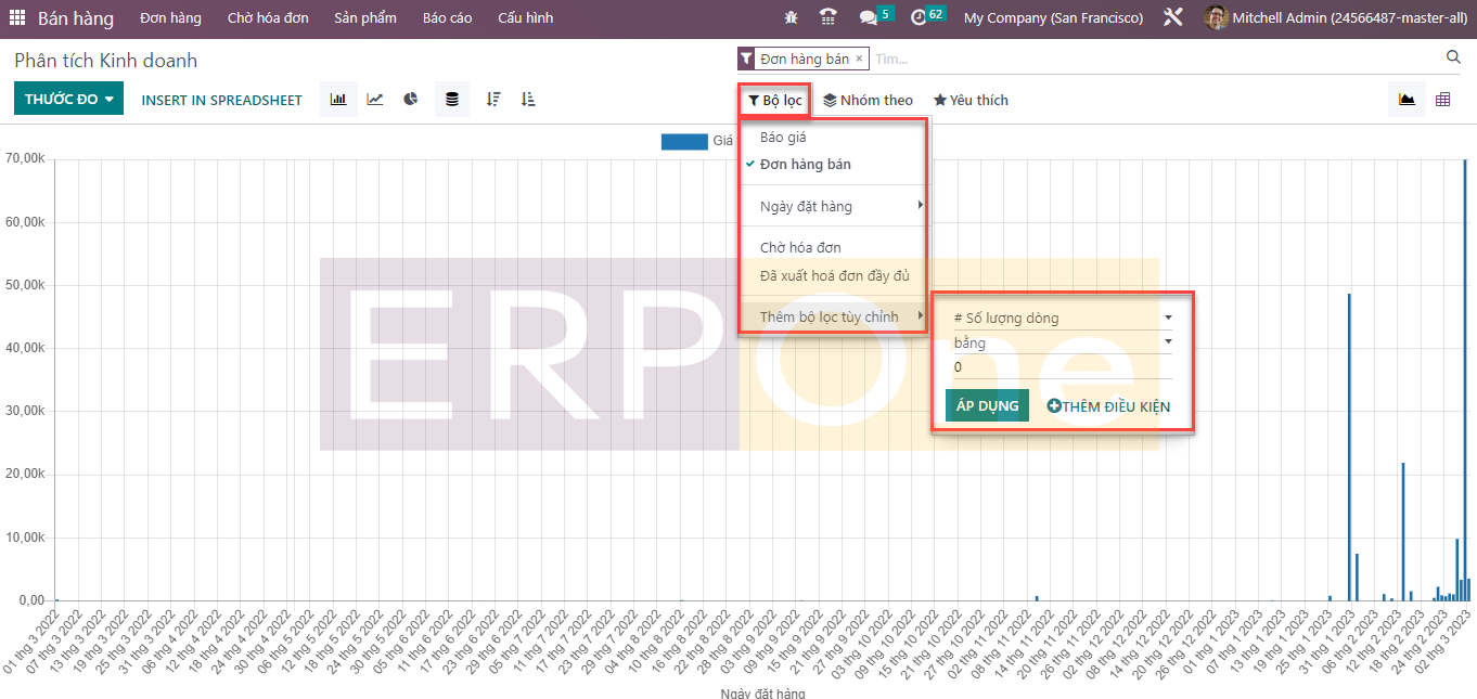 Bộ lọc sẽ giúp bạn tạo báo cáo dựa trên Đơn đặt hàng, Báo giá và Ngày đặt hàng. Tạo các báo cáo tùy chỉnh là một nhiệm vụ dễ dàng với sự trợ giúp của Odoo. đối với điều này, bạn có thể thêm các bộ lọc tùy chỉnh trên các báo cáo bằng cách sử dụng nút Thêm bộ lọc tùy chỉnh.