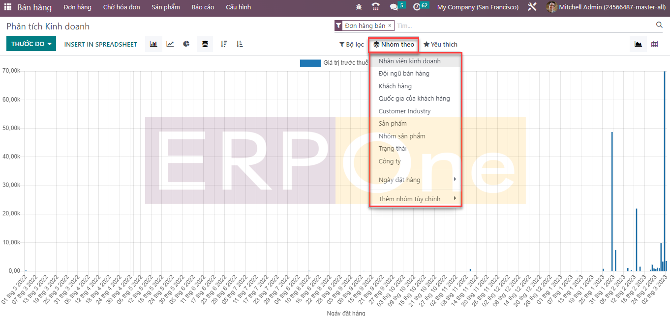 Bạn có thể nhóm báo cáo dựa trên Nhân viên kinh doanh,Đội ngũ bán hàng, Khách hàng, Quốc gia của khách hàng, Ngành của khách hàng, Sản phẩm, Nhóm sản phẩm, Trạng thái, Công ty và Ngày đặt hàng theo mặc định. Bạn có thể tạo các tùy chọn nhóm tùy chỉnh bằng cách sử dụng nút Thêm nhóm tùy chỉnh.