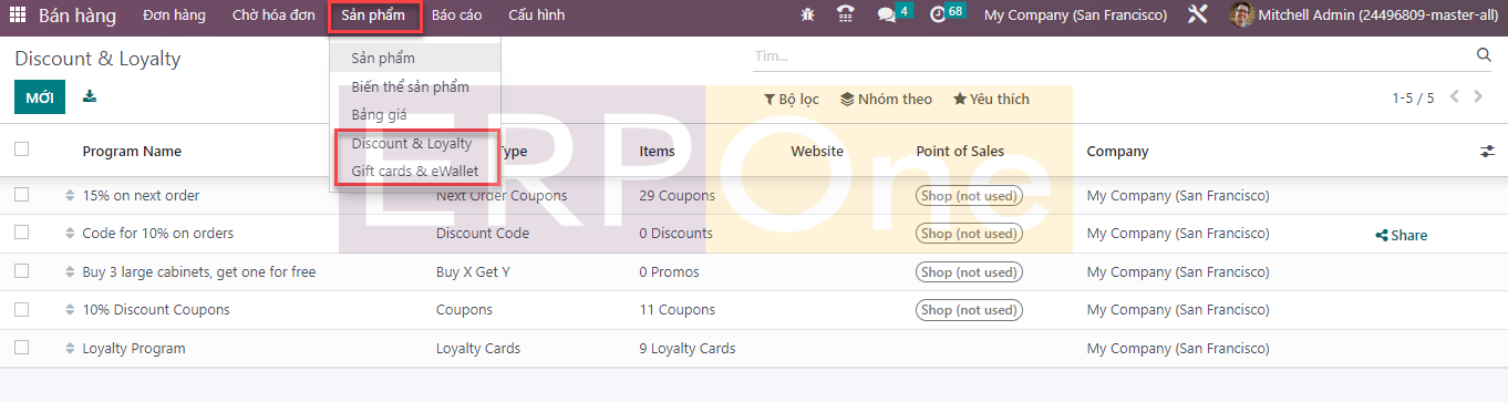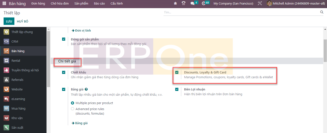 Trong tab Chi tiết giá, bạn sẽ có thể kích hoạt tính năng Discount, Loyalty và Gift Card như được đánh dấu trong ảnh chụp màn hình ở trên. Những tính năng này được sử dụng để thu hút khách hàng và do đó thúc đẩy doanh số bán hàng. Bạn có thể vào menu Sản phẩm nơi bạn có thể tìm thấy các tùy chọn riêng biệt để quản lý Giảm giá & Khách hàng thân thiết và Thẻ quà tặng & Ví điện tử.
