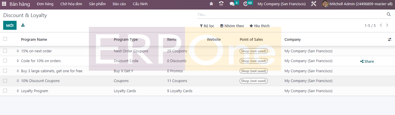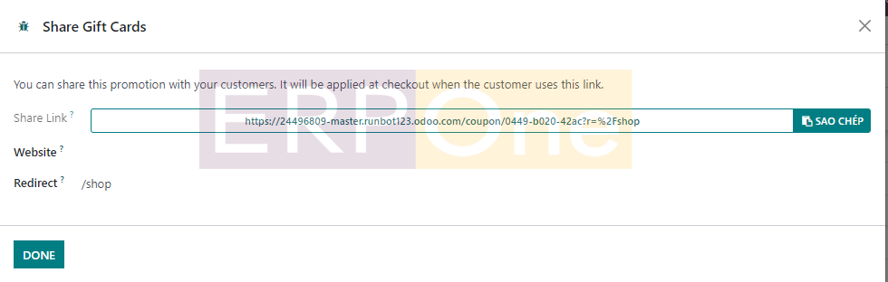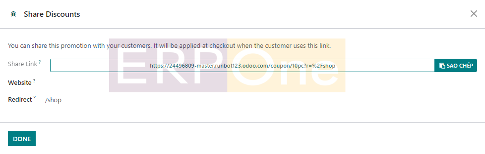 Bản xem trước của danh sách bao gồm Tên chương trình, Loại chương trình, Mục, Trang web, Cấu hình POS và chi tiết Công ty. Ngoài ra, bạn sẽ nhận được nút Chia sẻ giúp bạn chia sẻ phiếu giảm giá trên một trang web cụ thể. Một trình hướng dẫn sẽ xuất hiện ngay sau khi bạn nhấp vào nút Chia sẻ như mô tả bên dưới.