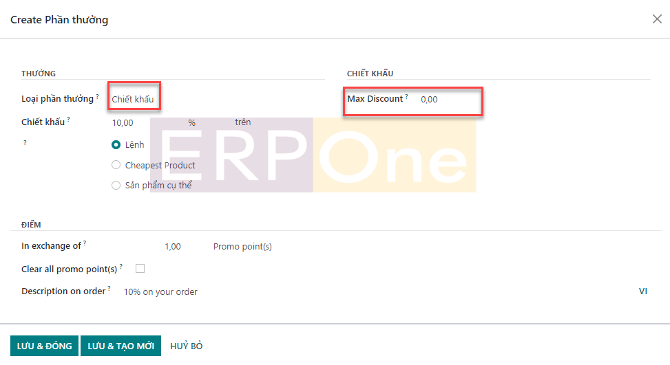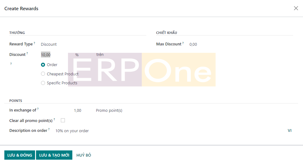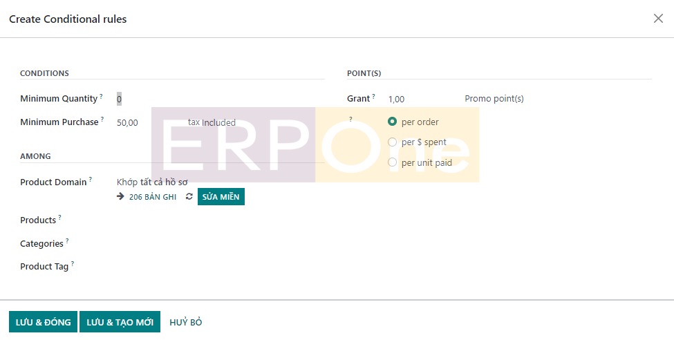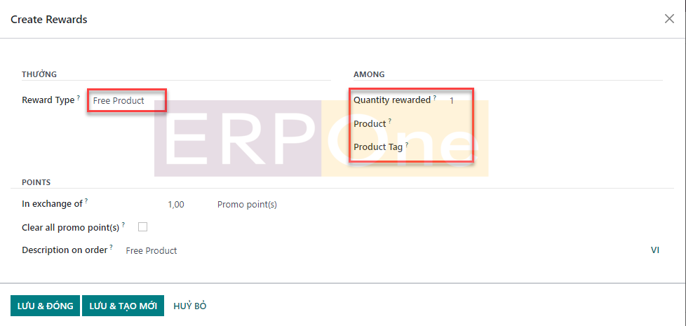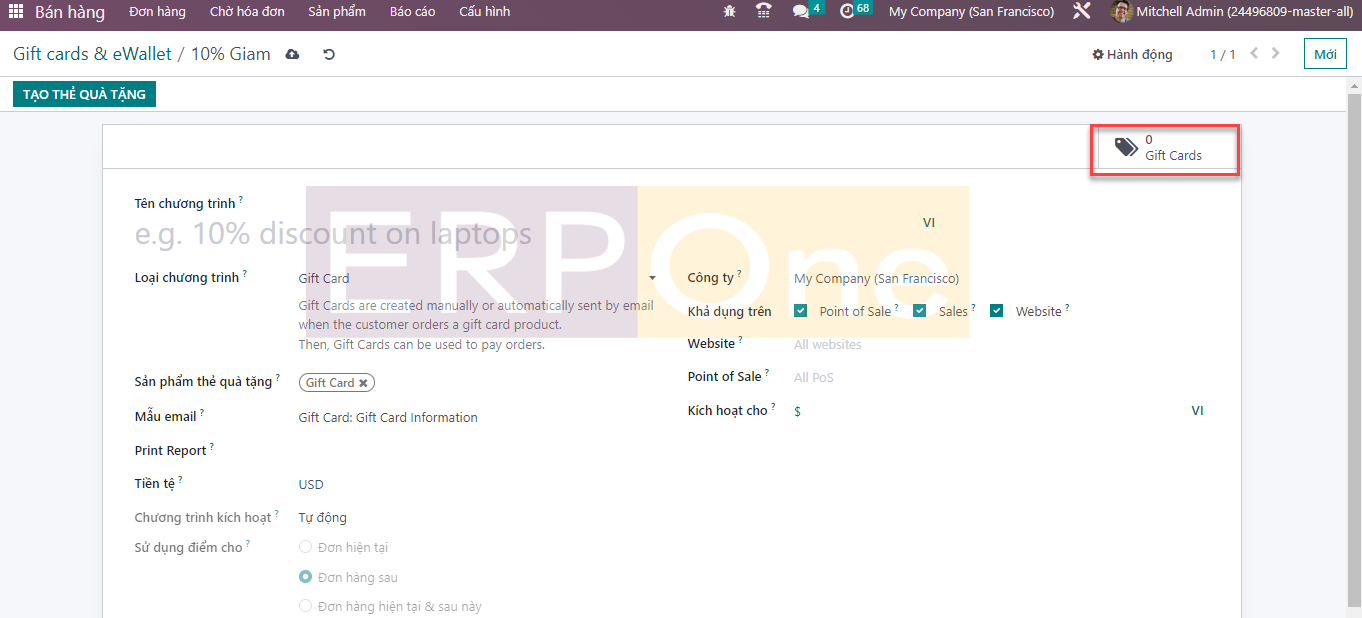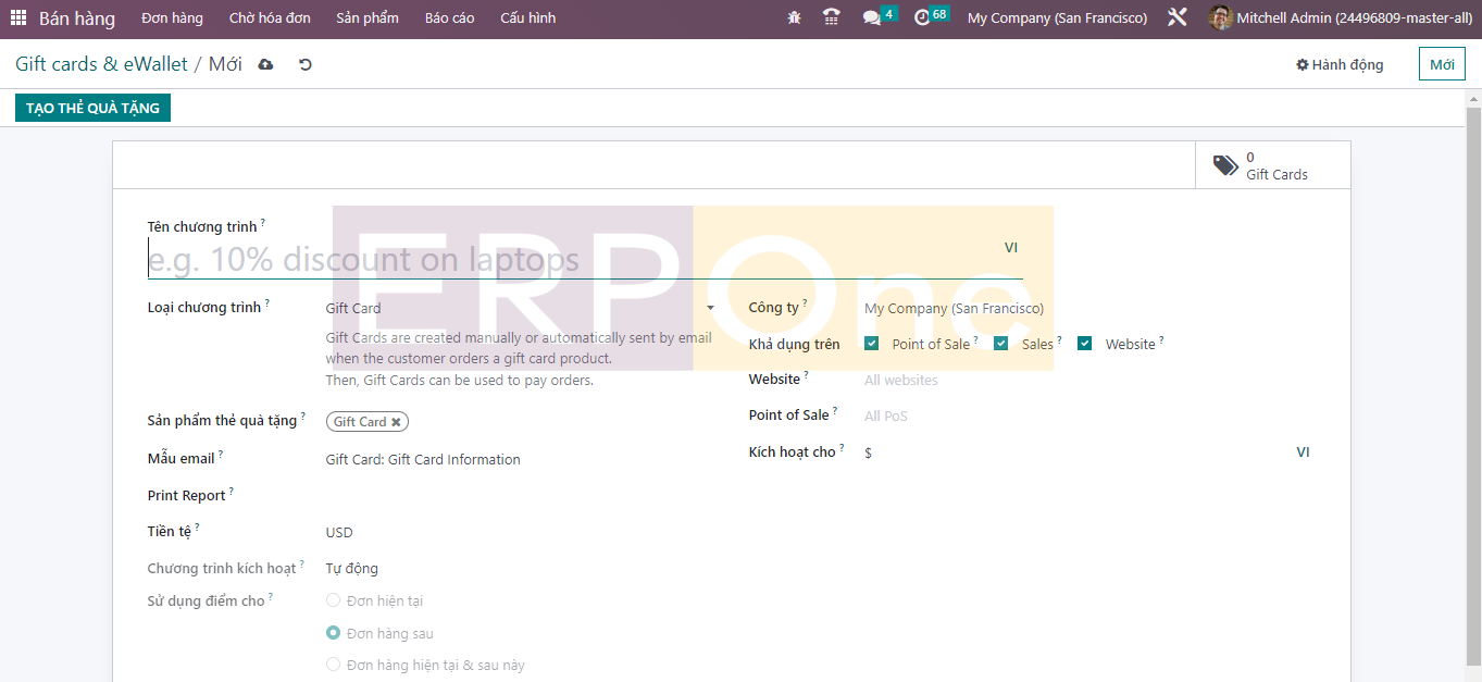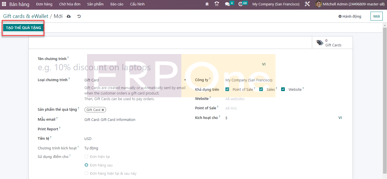 Khi bạn nhấp vào nút Tạo, Odoo sẽ dẫn bạn đến một cửa sổ cấu hình mới như hình bên dưới.