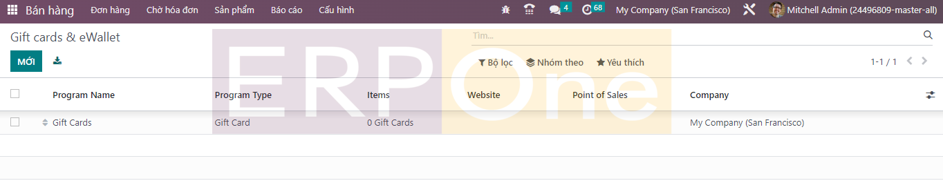 Một menu riêng để quản lý Thẻ quà tặng và Ví điện tử là một tính năng mới trong Odoo 16. Trong mô-đun Bán hàng Odoo mới, bạn sẽ nhận được các tính năng của Ví điện tử. Như trong hình bên dưới, nền tảng hiển thị danh sách Thẻ quà tặng và Ví điện tử với các chi tiết về Tên chương trình, Loại chương trình, Tên, Trang web, Cấu hình PoS và Công ty.