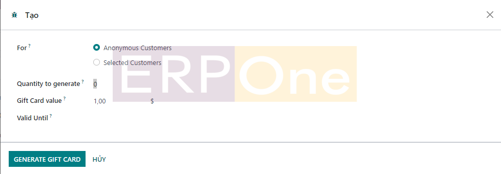 Sau khi tạo thẻ quà tặng mới, bạn có thể sử dụng nút Tạo thẻ quà tặng như được đánh dấu trong ảnh chụp màn hình ở trên. Một cửa sổ bật lên sẽ xuất hiện nơi bạn có thể cung cấp các chi tiết bổ sung cần thiết để tạo thẻ quà tặng.