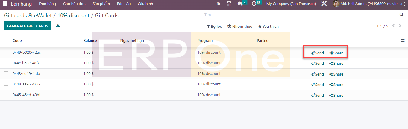 Ngay khi bạn nhấp vào nút này, danh sách tất cả các thẻ quà tặng đã tạo sẽ xuất hiện trên màn hình. Nó hiển thị các chi tiết của Mã thẻ quà tặng, Số dư, Ngày hết hạn, Chương trình và Đối tác.