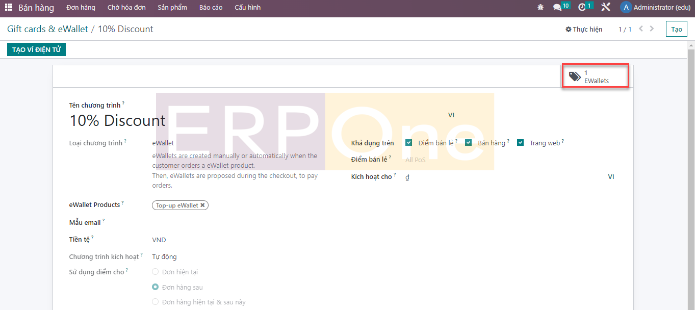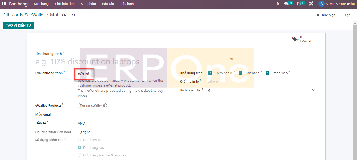Trong trường Sản phẩm eWallet, bạn có thể kích hoạt id sản phẩm. Bạn có thể tạo số lượng Ví điện tử cần thiết bằng cách nhấp vào nút Tạo Ví điện tử.