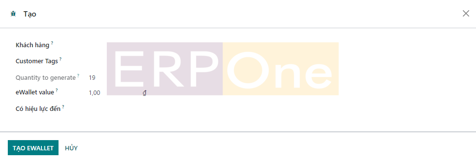 Một trình hướng dẫn mới sẽ xuất hiện nơi bạn có thể đề cập đến Khách hàng, Thẻ khách hàng, Số lượng cần tạo, Giá trị eWallet và Tính hợp lệ trong các trường tương ứng. Sử dụng nút Tạo Ví điện tử để tạo số lượng Ví điện tử cần thiết.