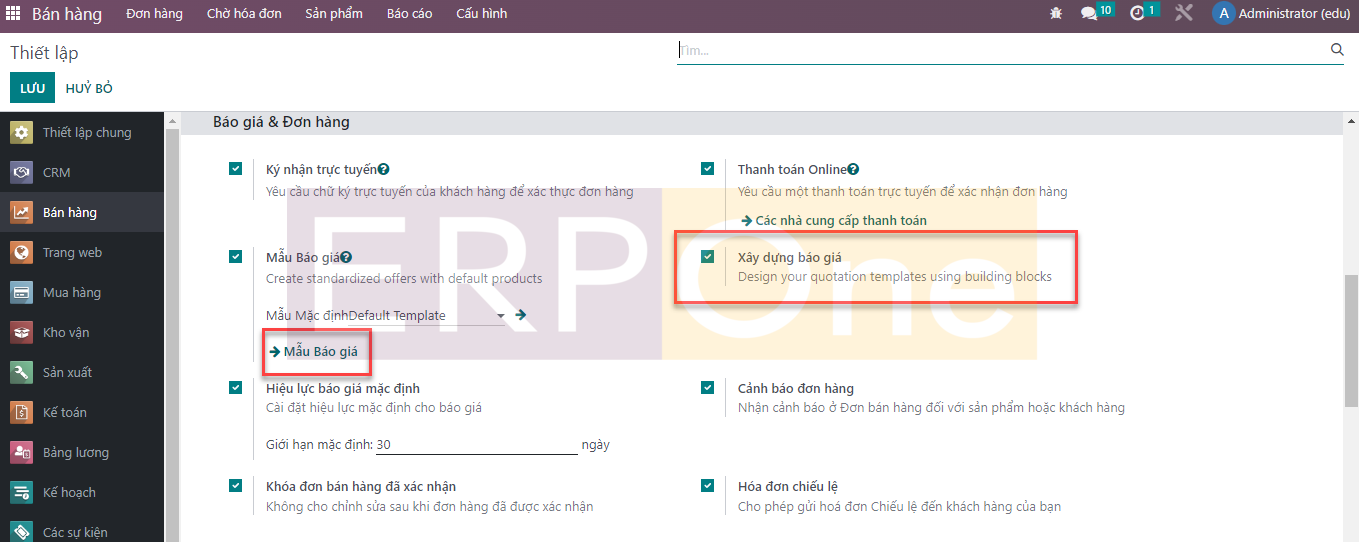 Cùng với tính năng này, bạn cũng được phép kích hoạt Xây dựng báo giá để có thể dễ dàng thiết kế các mẫu báo giá của mình với sự trợ giúp của các khối xây dựng nâng cao do Trang web Odoo cung cấp.
