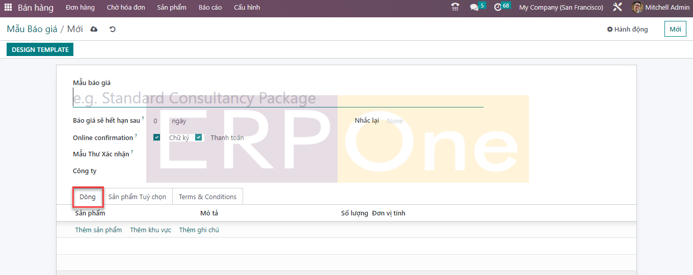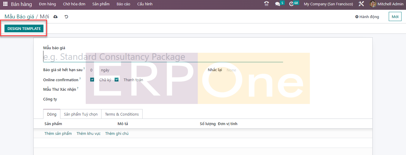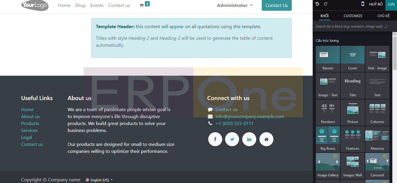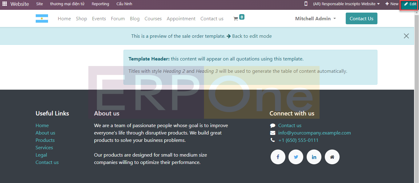 Nếu muốn thiết kế mẫu báo giá vừa tạo, bạn có thể click vào nút Design Template. Thao tác này sẽ dẫn bạn đến Trang web Odoo nơi bạn có thể nâng cao bản xem trước của báo giá bằng cách sử dụng các khối xây dựng nâng cao.