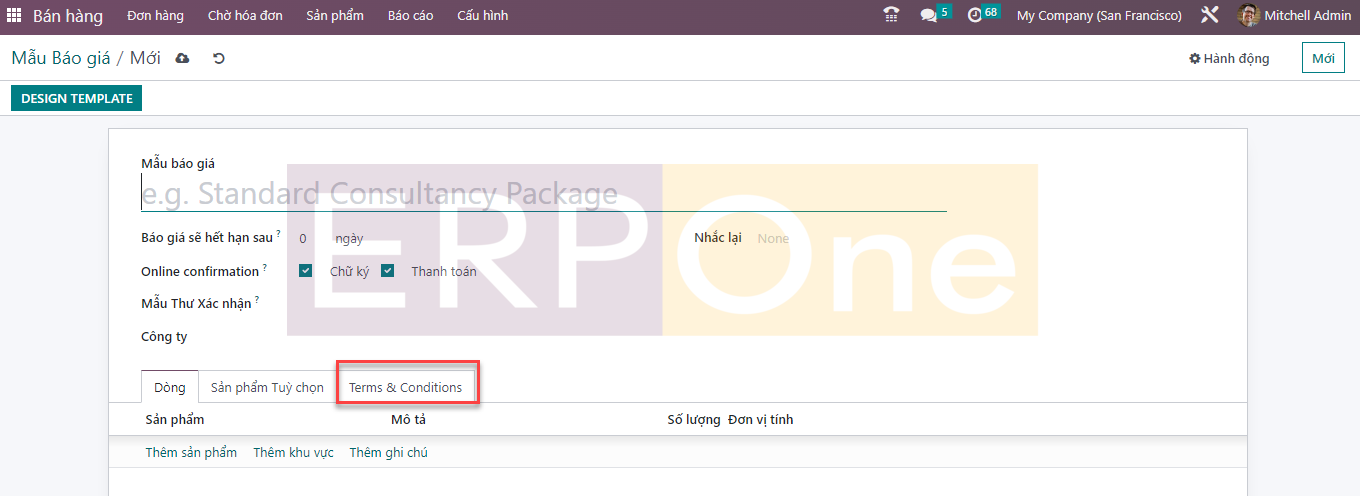 Tab Điều khoản & Điều kiện sẽ giúp bạn xác định các điều khoản và điều kiện liên quan đến mẫu báo giá này. Sau khi hoàn thành tất cả các trường bắt buộc, mẫu báo giá mới sẽ tự động được thêm vào hệ thống của bạn.