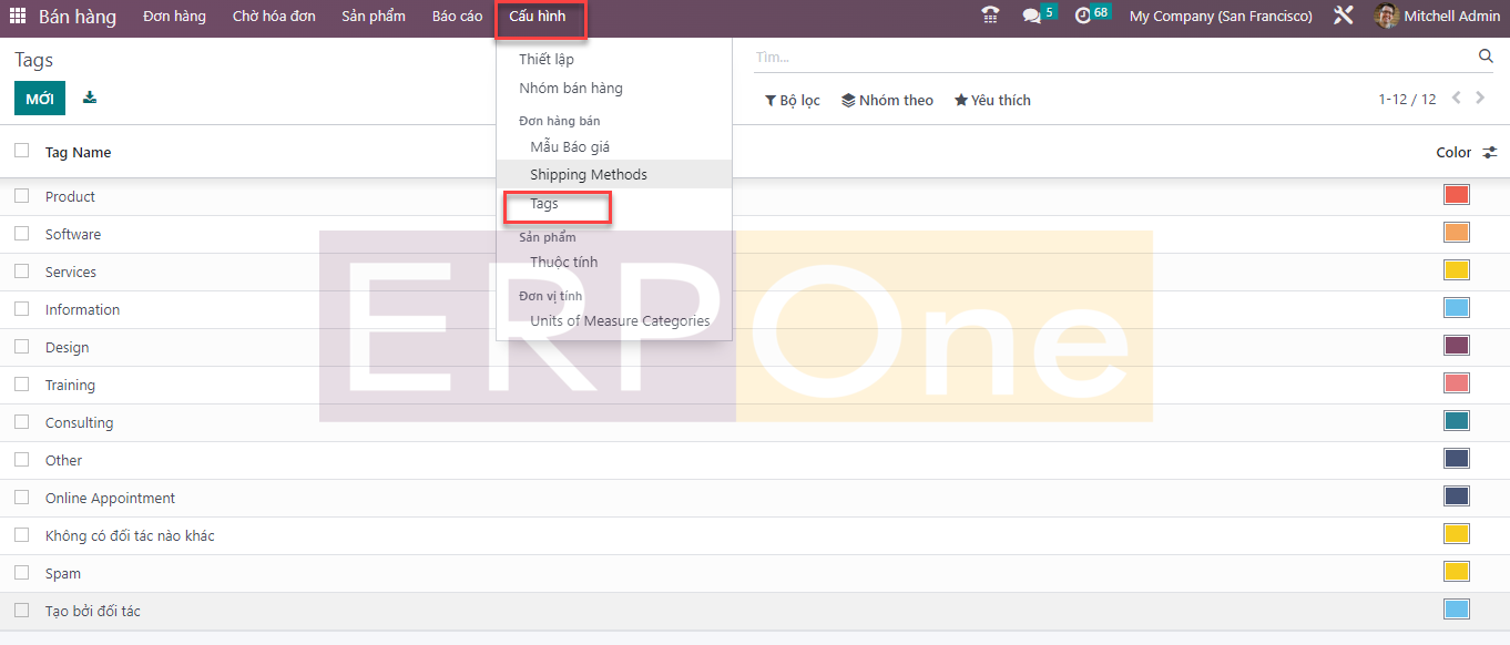 Thêm thẻ vào các hoạt động trong khi lưu chúng trong cơ sở dữ liệu của bạn sẽ luôn giúp bạn dễ dàng truy xuất dữ liệu khi cần. Odoo cho phép bạn lọc các hoạt động được định cấu hình dựa trên các thẻ được thêm vào chúng. Trong mô-đun Bán hàng của Odoo, bạn có thể dễ dàng định cấu hình các thẻ bán hàng đó cho các hoạt động bán hàng từ menu Cấu hình của mô-đun. Như trong hình bên dưới, bạn sẽ có quyền truy cập vào nền tảng Thẻ bán hàng từ menu Cấu hình.