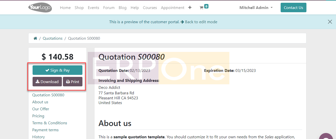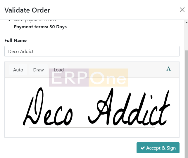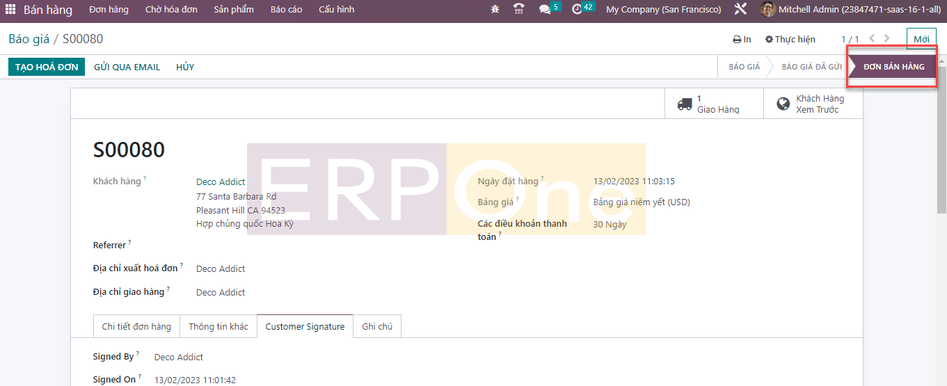 Sau khi khách hàng xác nhận báo giá, nó sẽ tự động được chuyển đổi thành đơn đặt hàng. Từ cổng thông tin khách hàng, khách hàng có thể xác nhận báo giá bằng cách nhấp vào nút Ký & Thanh toán.