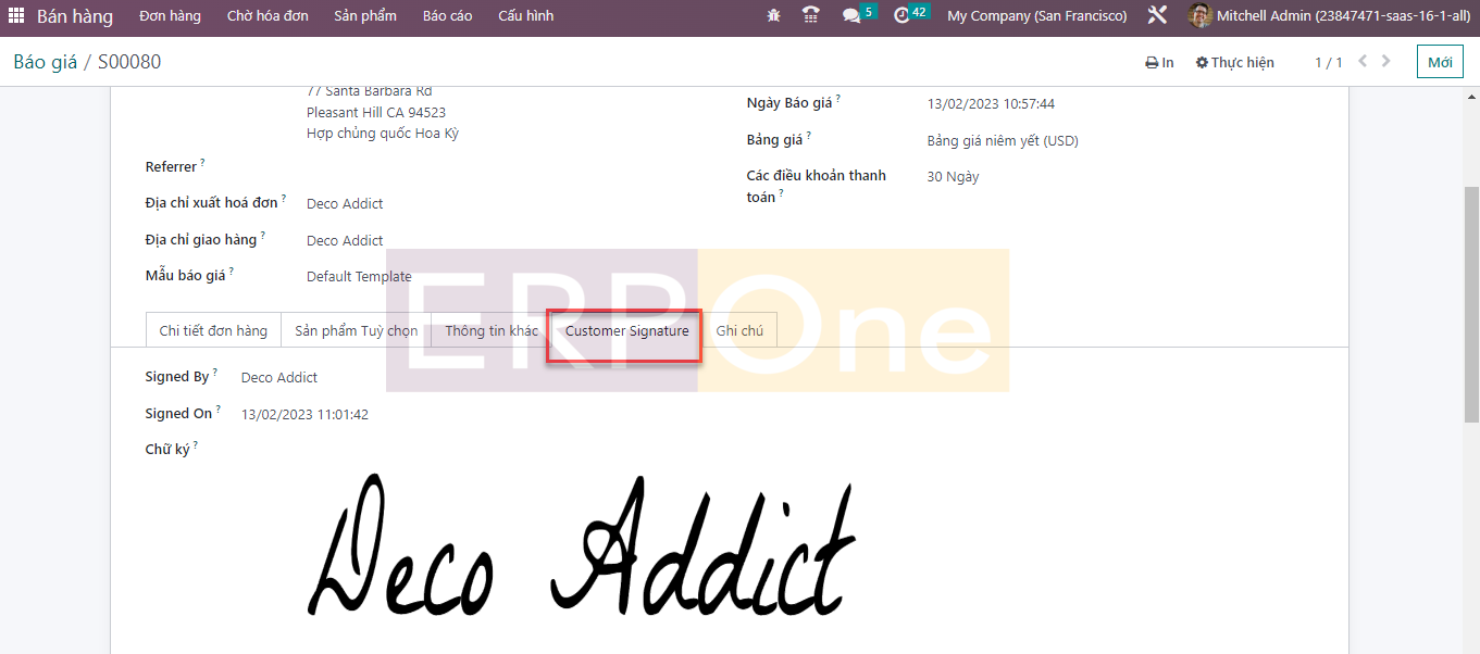Khách hàng có thể nhấn vào nút Chấp nhận & Ký và hoàn tất thủ tục thanh toán. Khi bạn kiểm tra báo giá bán hàng trong phần phụ trợ, bạn có thể thấy rằng tab Chữ ký của khách hàng được tự động tải lên với các chi tiết về chữ ký của khách hàng.
