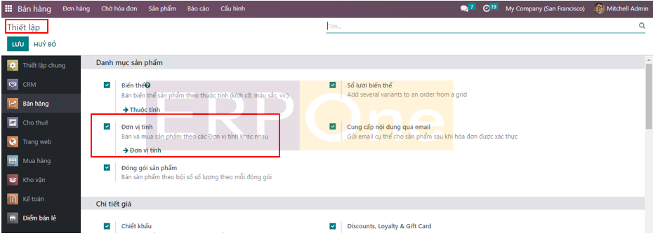 Định cấu hình đơn vị đo lường là điều cần thiết để đo số lượng sản phẩm được định cấu hình trong cơ sở dữ liệu của bạn. Khi mua bán sản phẩm, bạn cần phụ thuộc vào các loại biện pháp khác nhau. Bạn có thể dễ dàng định cấu hình các đơn vị đo lường đó trong mô-đun Bán hàng của Odoo. Để có được tính năng này, bạn có thể vào menu Cài đặt.