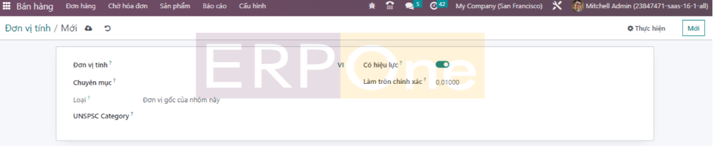 Tên của UoM mới có thể được chỉ định trong trường Đơn vị đo lường. Chỉ định Danh mục của UoM trong trường tương ứng. Chuyển đổi giữa các đơn vị đo lường sẽ chỉ có thể thực hiện được nếu chúng thuộc cùng một loại. Loại UoM có thể là Đơn vị đo tham chiếu cho danh mục, Nhỏ hơn Đơn vị đo tham chiếu hoặc Lớn hơn Đơn vị đo tham chiếu. Bạn có thể chọn một loại phù hợp cho UoM mới. Trong trường Độ chính xác làm tròn, bạn có thể thêm giá trị làm tròn để tính giá trị phù hợp nhất của UoM. Bằng cách bật trường Hoạt động, bạn có thể kích hoạt UoM mới.