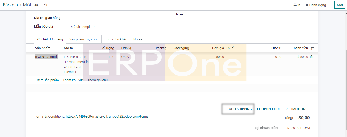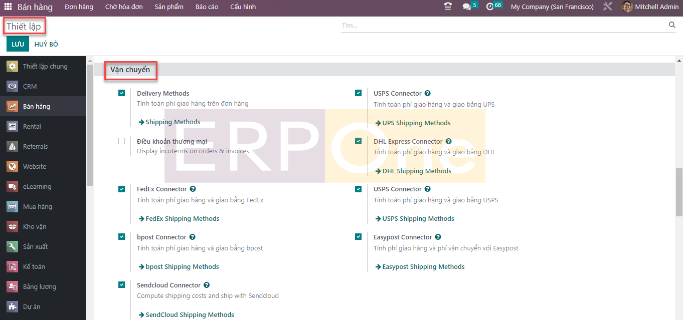 Khi khách hàng đặt hàng sản phẩm hoặc dịch vụ từ công ty của bạn, bạn phải đảm bảo các phương pháp hoặc tuyến đường tốt nhất để giao sản phẩm hoặc dịch vụ tại địa điểm của khách hàng mà không có bất kỳ sự chậm trễ hoặc khiếm khuyết nào. Trong hệ thống Odoo ERP, bạn có thể lưu hồ sơ và quản lý các phương thức vận chuyển mà một công ty sử dụng để vận chuyển sản phẩm của họ đến khách hàng tương ứng. Giao sản phẩm đúng thời gian, không gây hư hỏng sản phẩm với chi phí vận chuyển hợp lý sẽ giúp công ty bạn tạo được ấn tượng tốt với khách hàng. Công ty có thể giao sản phẩm trực tiếp cho khách hàng hoặc nhờ sự trợ giúp của các công ty vận chuyển bên thứ ba. Trong cả hai phương thức vận chuyển này, Odoo sẽ đảm bảo quy trình làm việc liền mạch bằng cách đảm bảo giám sát chính xác các quy trình vận chuyển.