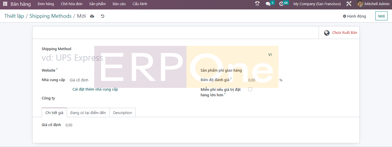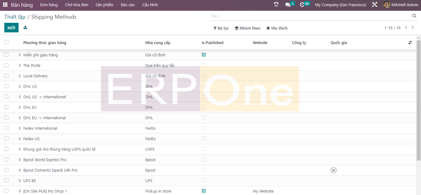 Bạn có thể tìm thấy danh sách các phương thức vận chuyển đã được định cấu hình trên nền tảng này. Nó hiển thị thông tin liên quan đến Phương thức giao hàng, Nhà cung cấp, Được xuất bản, Trang web, Công ty và Quốc gia. Hãy tạo một phương thức vận chuyển mới để phân phối sản phẩm bằng Nút Mới.