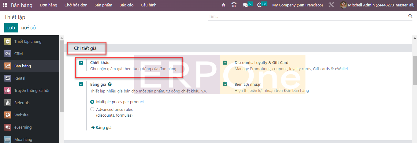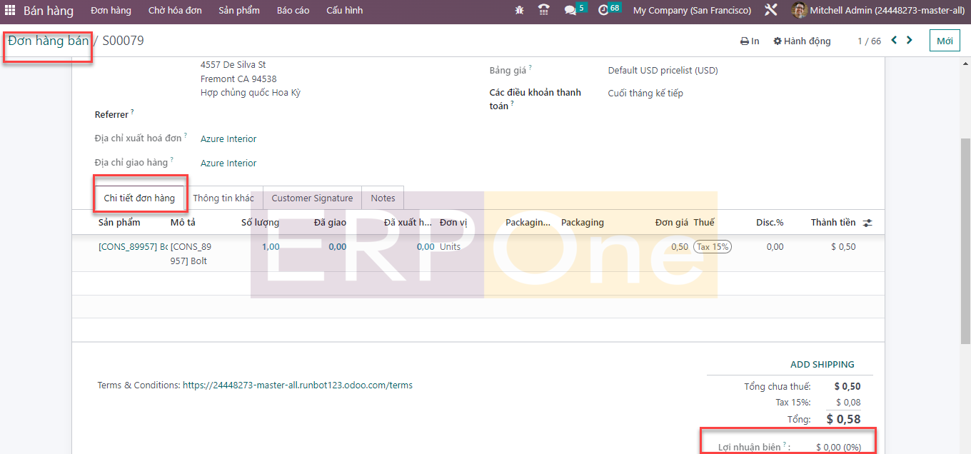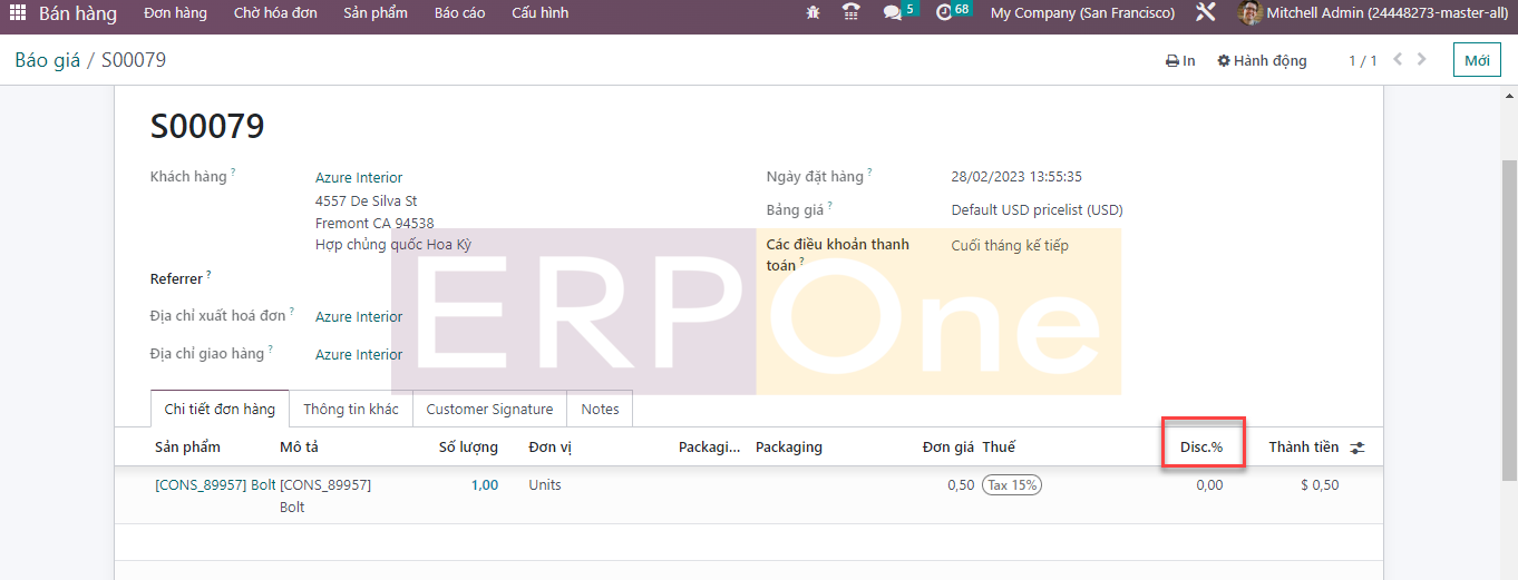 Bạn có thể áp dụng chiết khấu theo cách thủ công như trong hình bên dưới trong Dòng đơn đặt hàng hoặc Odoo sẽ tự động hiển thị chiết khấu được tính từ bảng giá tương ứng.