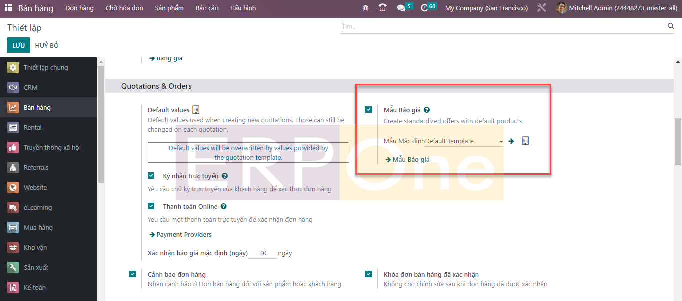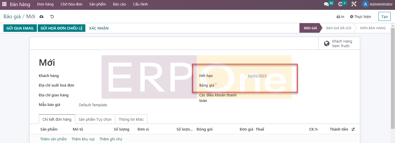 Giới hạn mặc định trong một số ngày cụ thể có thể được đề cập ở đây. Trong khi tạo đơn đặt hàng hoặc báo giá mới, bạn sẽ nhận được Ngày hết hạn trên cửa sổ. Nó sẽ được tính dựa trên giá trị mặc định.