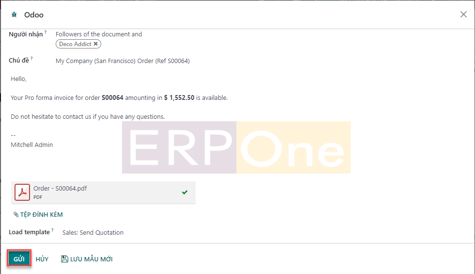 Thư được tạo tự động sẽ hiển thị chi tiết về số lượng và số lượng đơn đặt hàng. Bạn có thể chỉnh sửa nội dung của thư theo nhu cầu của bạn. Bạn cũng có thể đính kèm báo giá bán hàng trong thư này để hách hàng có được ý tưởng chính xác về giá cả, điều khoản & điều kiện và các ưu đãi khác do công ty đề xuất. Nhấp vào nút Gửi.