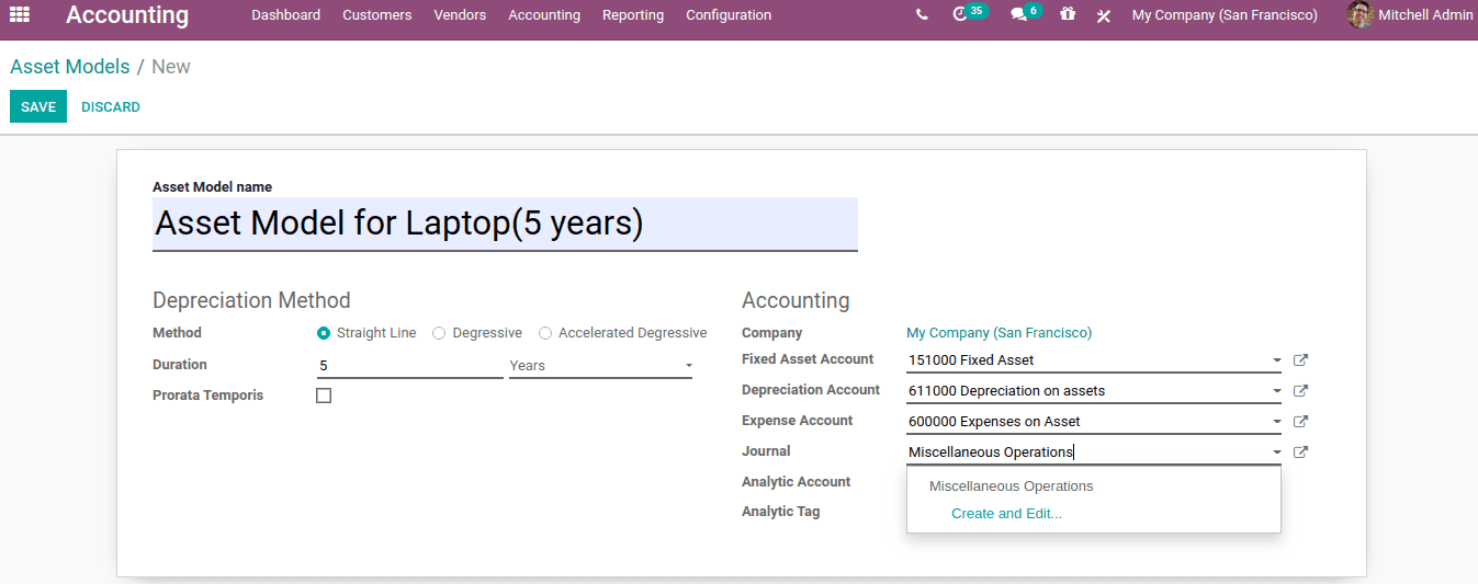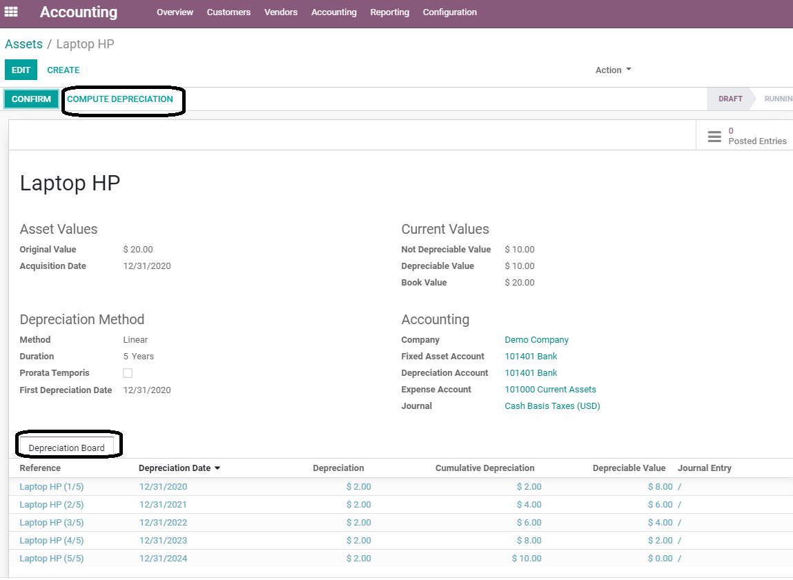 Odoo hỗ trợ theo dõi, quản lý quá trình sử dụng tài sản theo vòng đời từ khi mua về đến khi tài sản cần thanh lý với 8 pha cụ thể là: